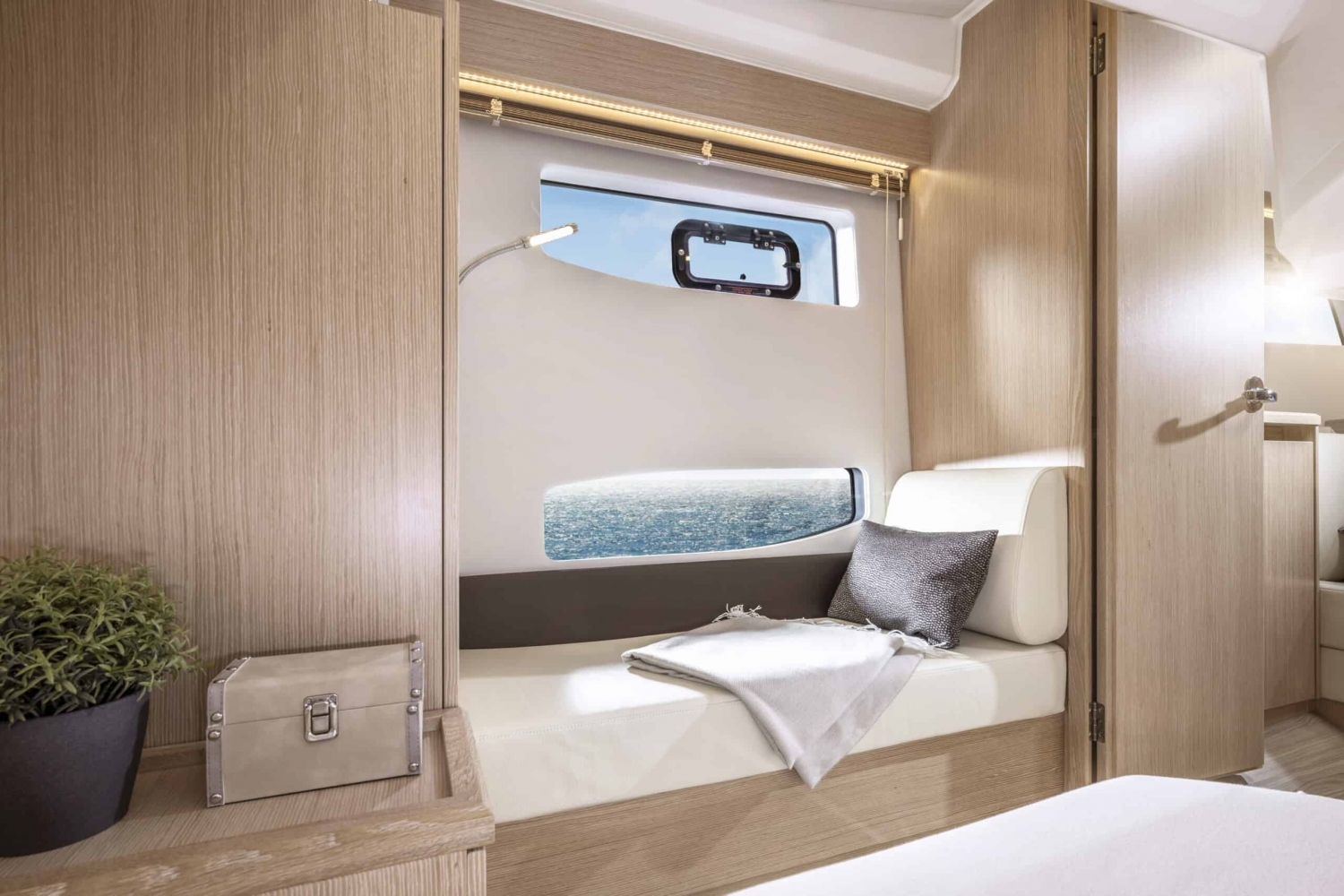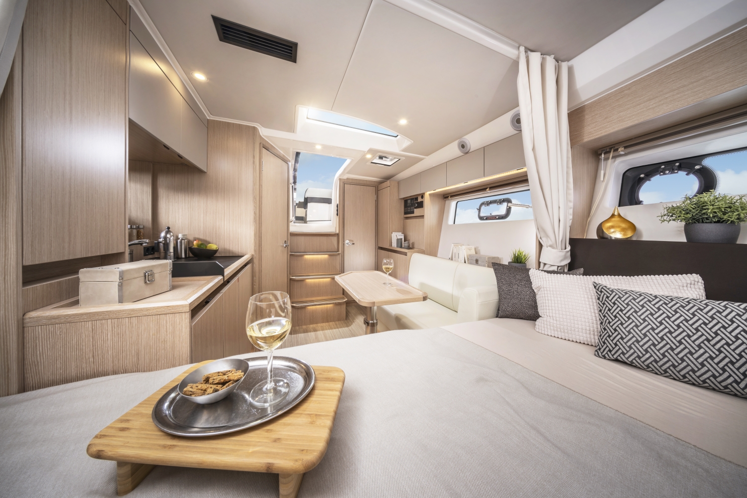Unter Deck bietet das durchdachte Konzept viel Licht, viel Platz, vier Schlafplätze, eine Kabine und einen großen Salon. Der Salon und das Doppelbett im Bug verschmelzen zu einem großzügigen, loftartigen Raum. Tagsüber sorgt die offene Raumgestaltung mit großen Rumpffenstern und Oberlicht für Licht und ein angenehmes Raumgefühl. Wenn alle Gäste über Nacht bleiben möchten, kann der Salontisch abgesenkt werden, um eine weitere Schlafkoje zu schaffen, sodass nichts gemütlichen Stunden unter Deck im Wege steht.