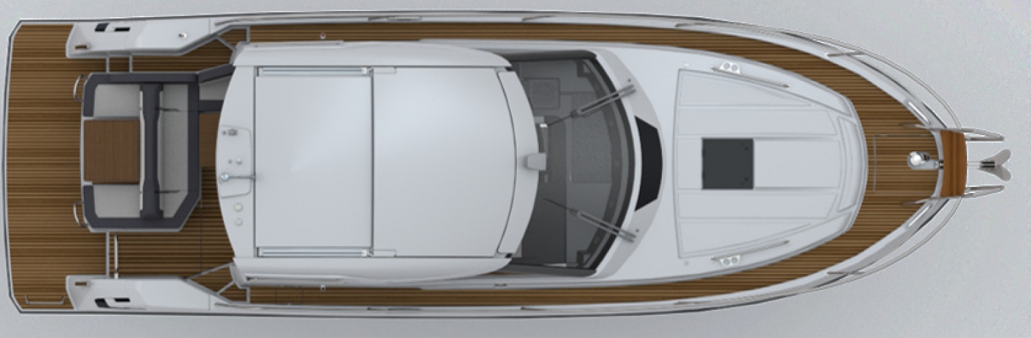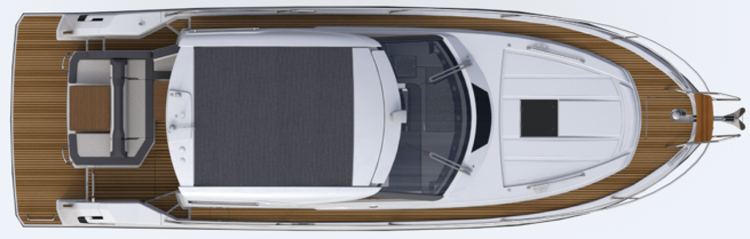 Das Ziel des Entwicklungsteams bei der Gestaltung des Steuerstands war es, Kraft und Freiheit miteinander zu verbinden. Dank der Konstruktion des Hardtops mit robusten Edelstahlstreben am Heck und großen Fensterflächen bietet sich ein nahezu uneingeschränkter 360-Grad-Blick. Vom Lounge-Bereich an Backbord haben Sie die beste Sicht nach vorne und können gemeinsam mit dem Steuermann die Sonne und den Wind durch das große Sonnendach genießen.