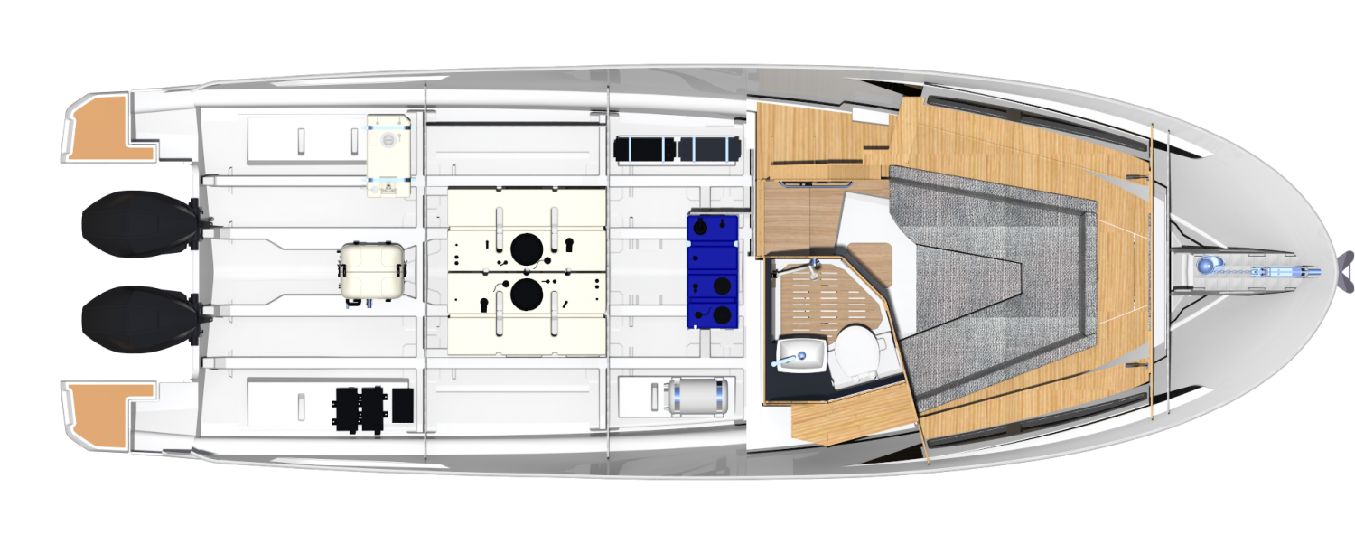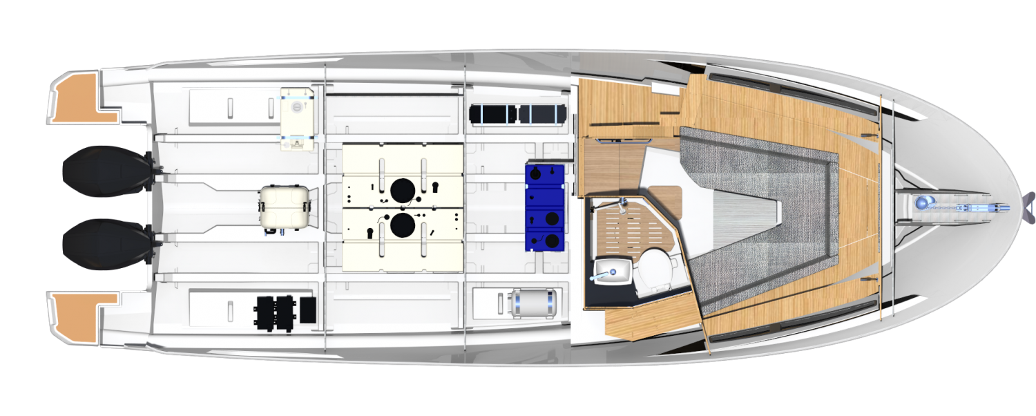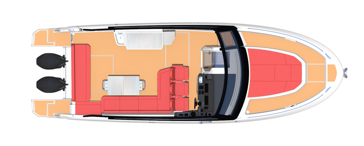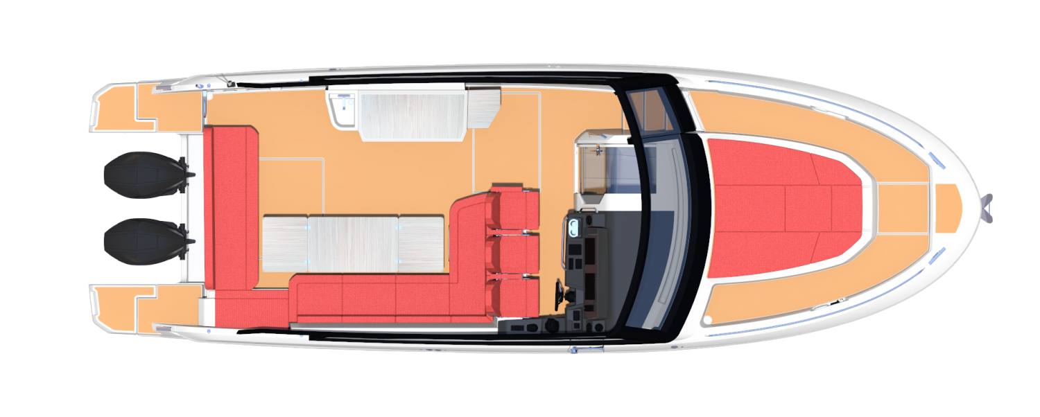 Das Hardtop bietet Schutz und Licht zugleich. Das große Softtop über dem Steuerstand sorgt für eine sanfte Brise im Cockpit. Das kleinere Softtop über dem Heck lässt sich öffnen, um noch mehr Sonne hereinzulassen. Für ausgiebiges Badevergnügen ist eine optional hydraulisch absenkbare Badeplattform erhältlich.