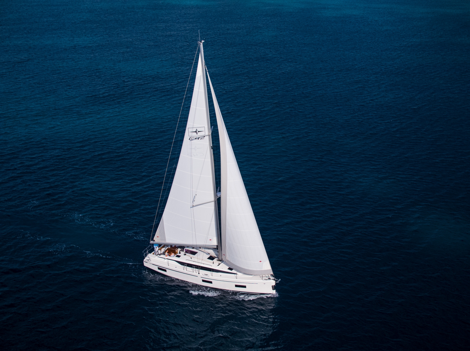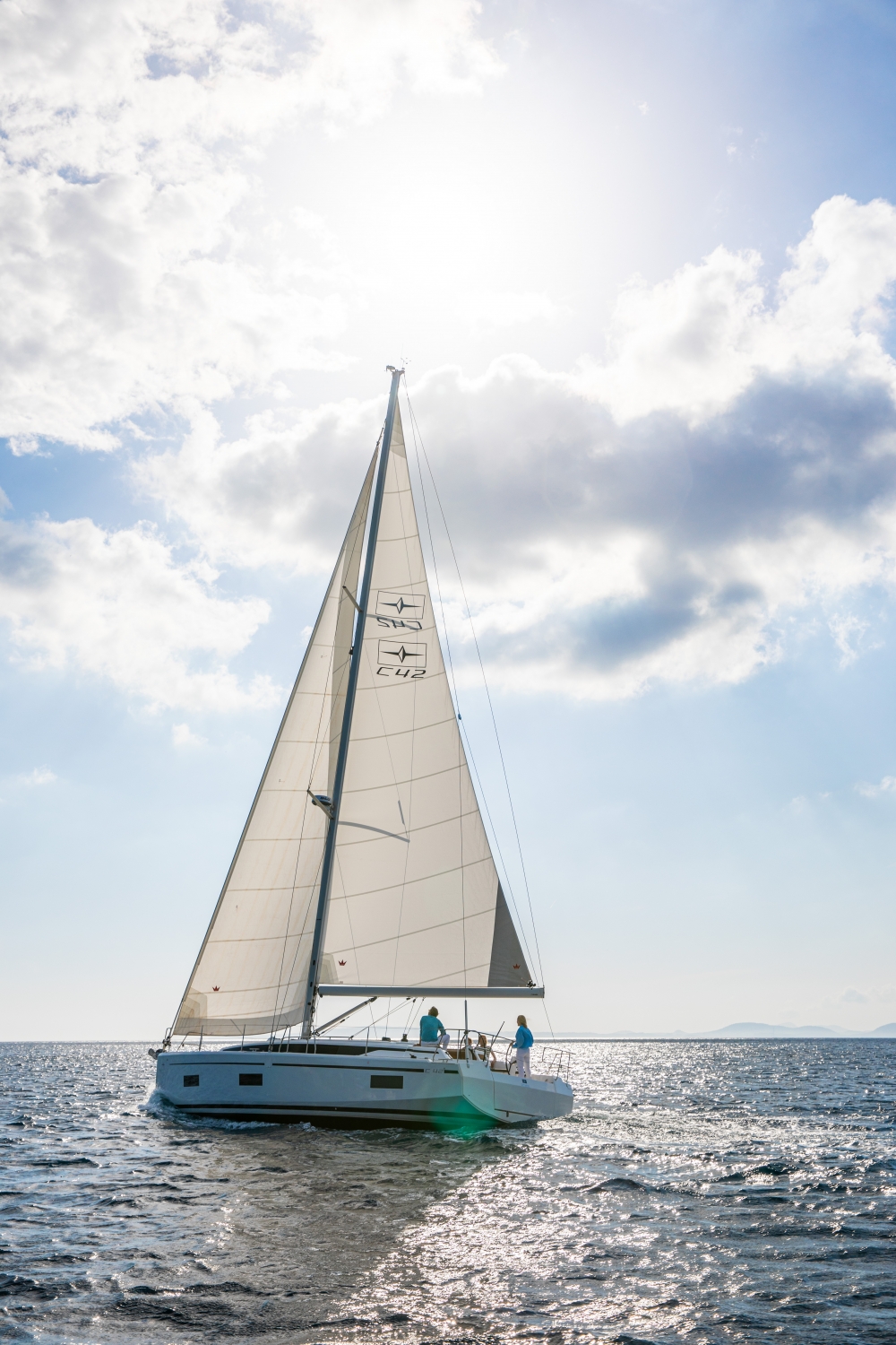 Bei seitlichem Wind oder vor dem Wind sorgen ein Code-0-Segel (85 Quadratmeter) und ein Gennaker (140 Quadratmeter) für maximale Geschwindigkeit. Die Selbstwendefock ermöglicht einfachstes Handling beim Wenden. Außerdem ist sie in der Standardausführung der BAVARIA C42 enthalten. Um den Zwei-Spreizermast auf allen Kursen perfekt trimmen zu können, sind bei der BAVARIA C42 ein Achterstag und ein Achterstagspanner serienmäßig enthalten.