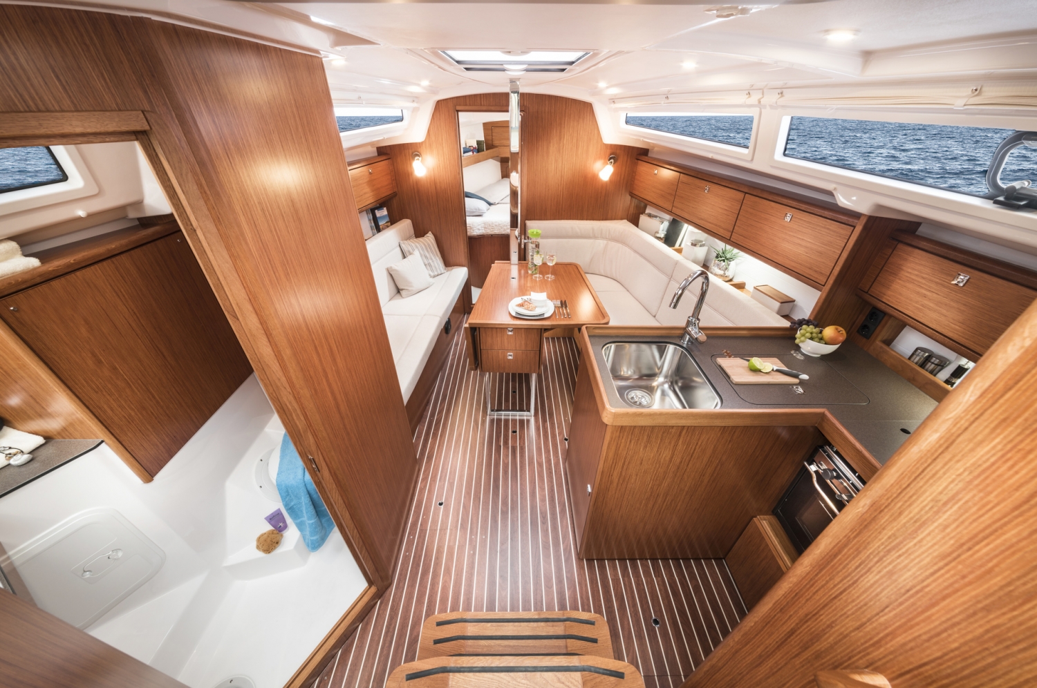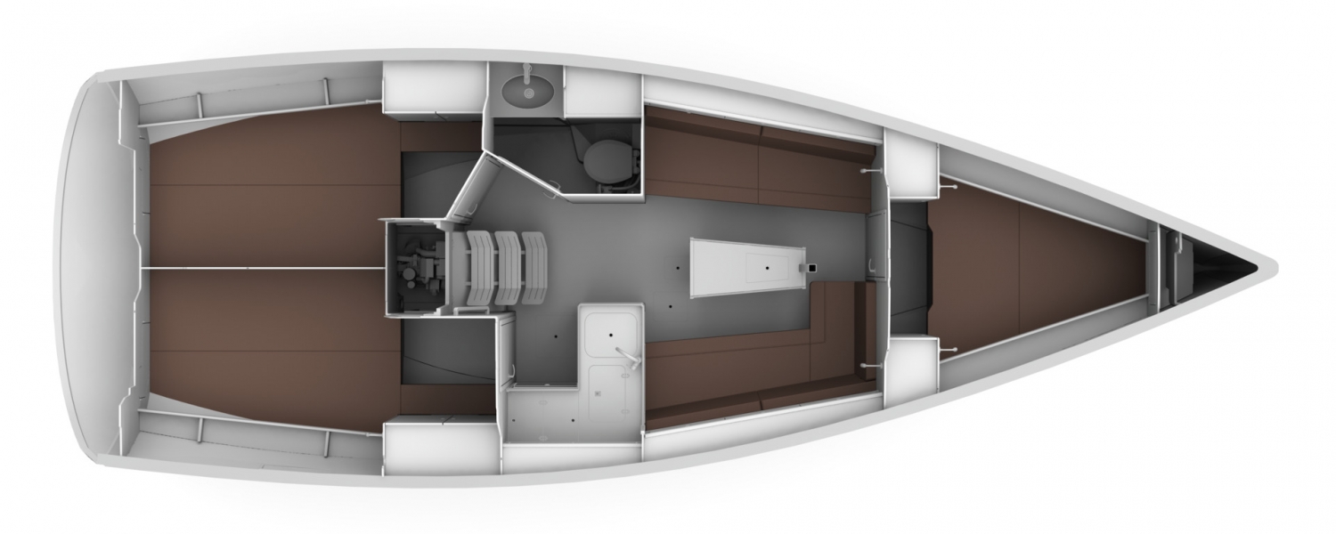 Die BAVARIA CRUISER 34 bietet Platz für bis zu sechs Personen. Keiner von ihnen wird etwas vermissen, auch nicht, wenn es ums Schlafengehen geht. Im Heck befinden sich zwei gleich große Kabinen, im Bug eine weitere, äußerst komfortable Kabine für den Eigner. Hell gestaltet, mit schönen Holzdetails – kurz gesagt, drei Kabinen, in denen man gerne schlafen geht und nur schwer aufstehen kann.