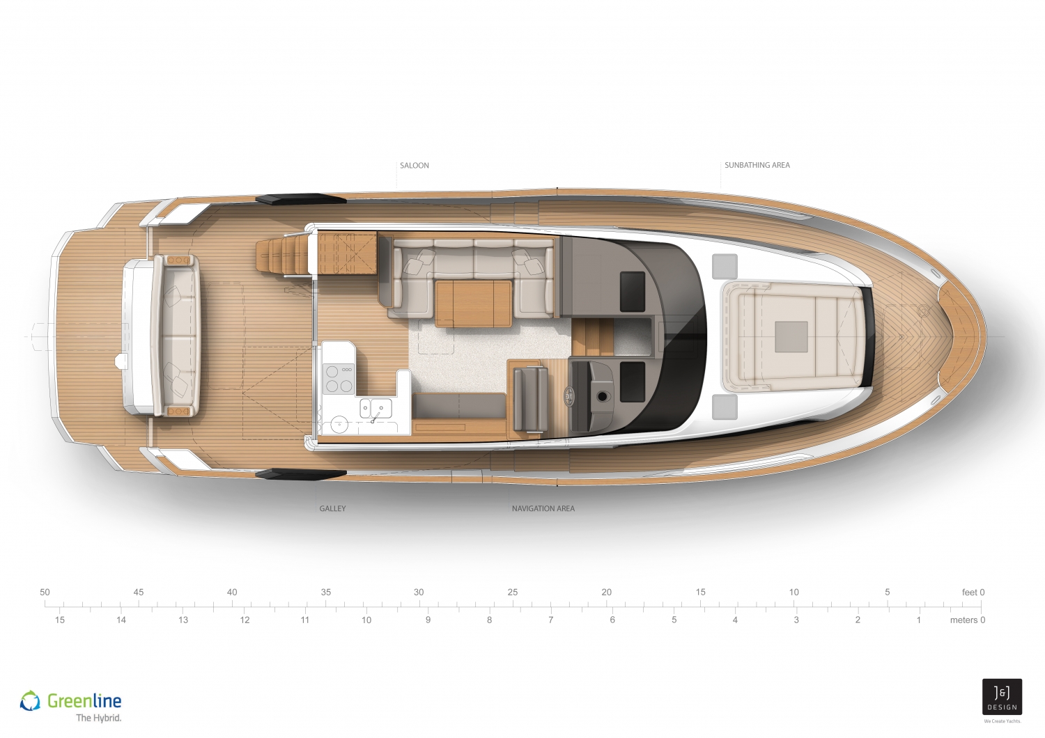 The Greenline 48 has three different entry height levels (stern platform, side exit, bow), allowing you to always board and disembark safely. It offers one of the largest and most comfortable flybridges in her class, featuring a wet bar with grill, U-shaped settee and sunbathing area.