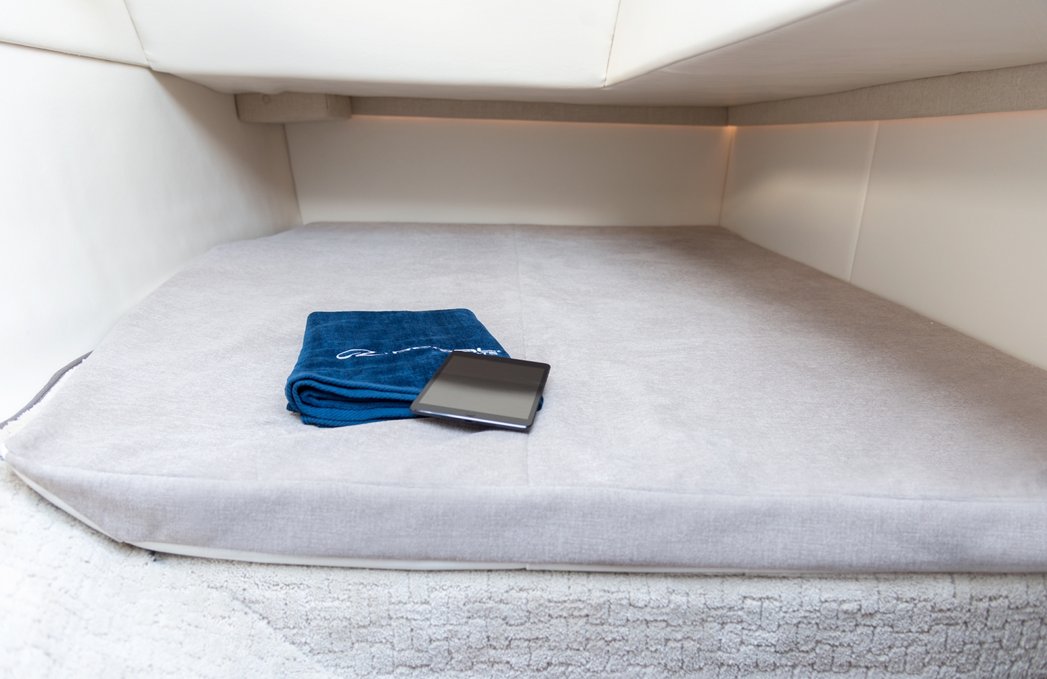A queen bed with ample space tucked is neatly under the cockpit with LED accent lighting that adds a warm, luxurious feel.