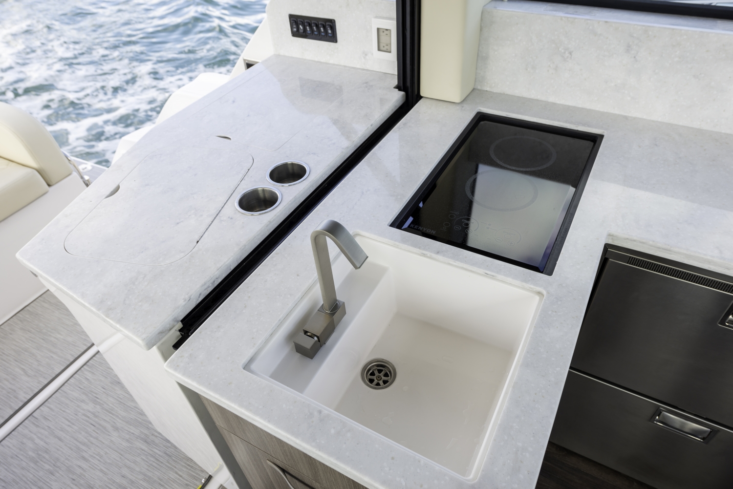 Lehnen Sie sich zurück und genießen Sie die Sonne oder setzen Sie sich aufrecht hin und beobachten Sie das Wasser auf der mehrfach verstellbaren Sonnenliege auf dem Vordeck. Die optionale Cabana ist ideal, wenn Sie die Aussicht lieben, aber etwas Schatten wünschen.