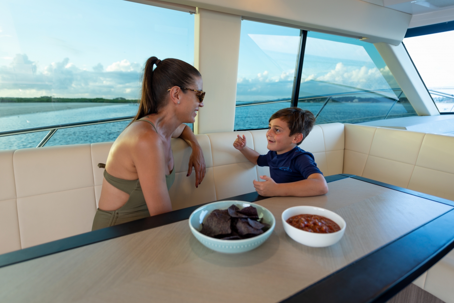 Dank der Außenbordmotoren sind Sie mit Ihrer Familie nur wenige Schritte vom Strand entfernt. Der 42 FXO ist das einzige Modell seiner Klasse, das dies ermöglicht.