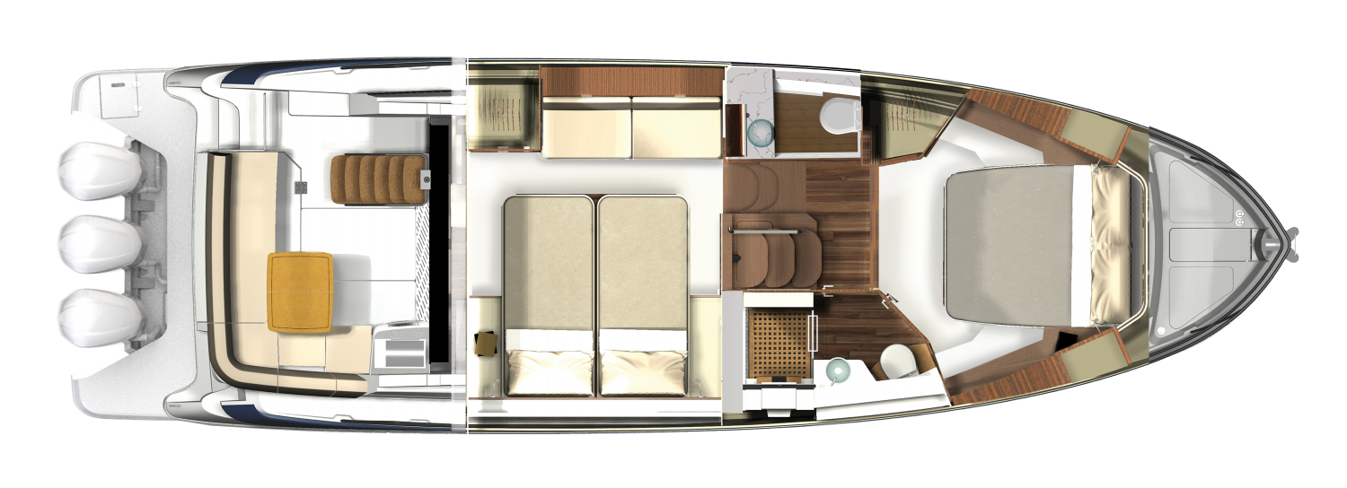 Passen Sie Ihr 42 FXO an Ihre Bedürfnisse an. Wählen Sie entweder ein Erfrischungszentrum oder einen zweiten Kopf in der Kabine.